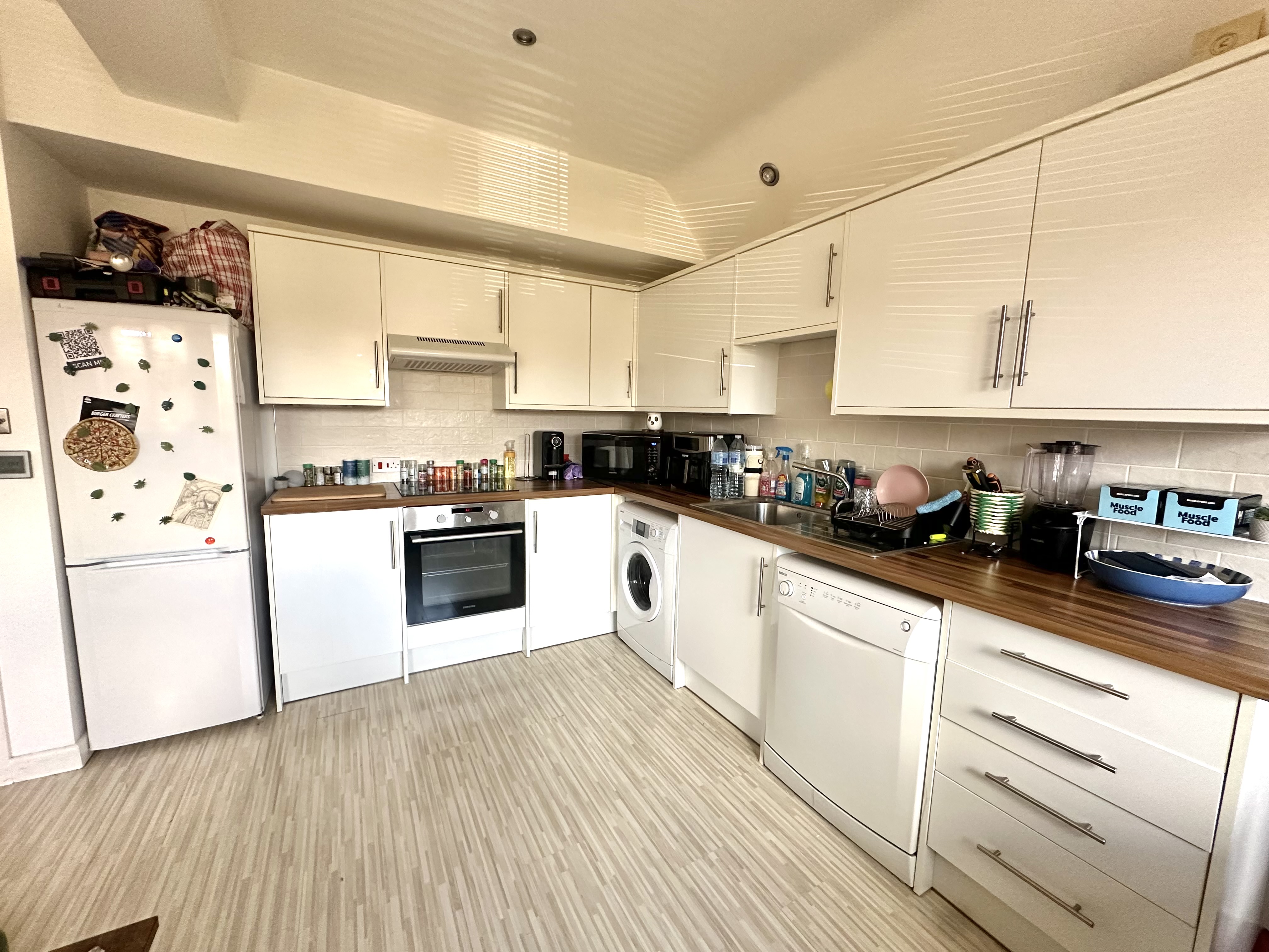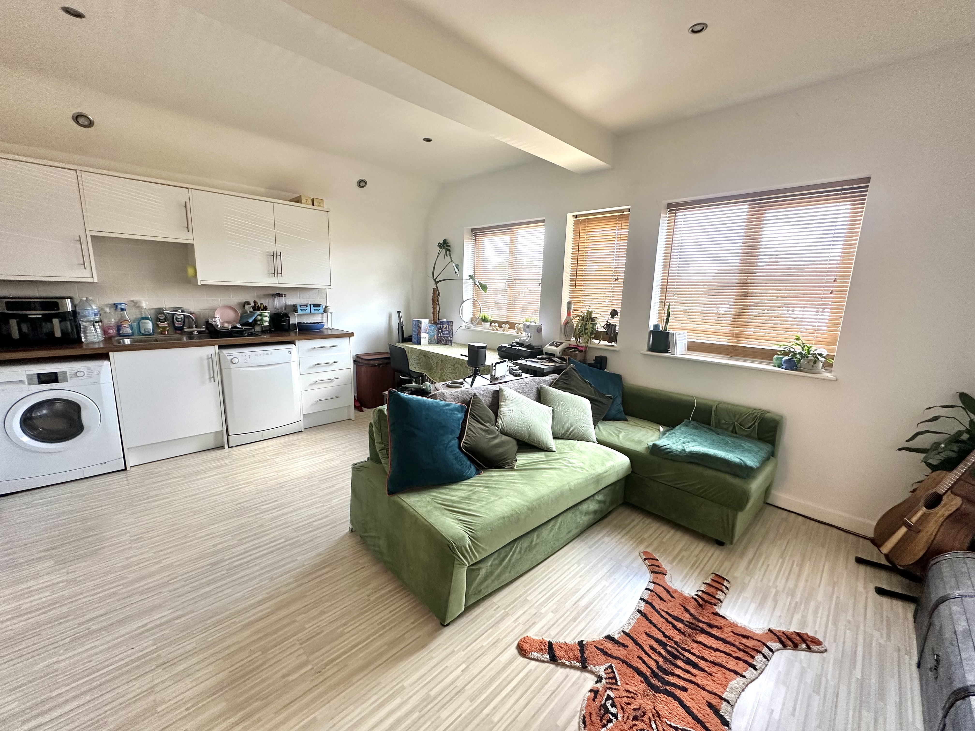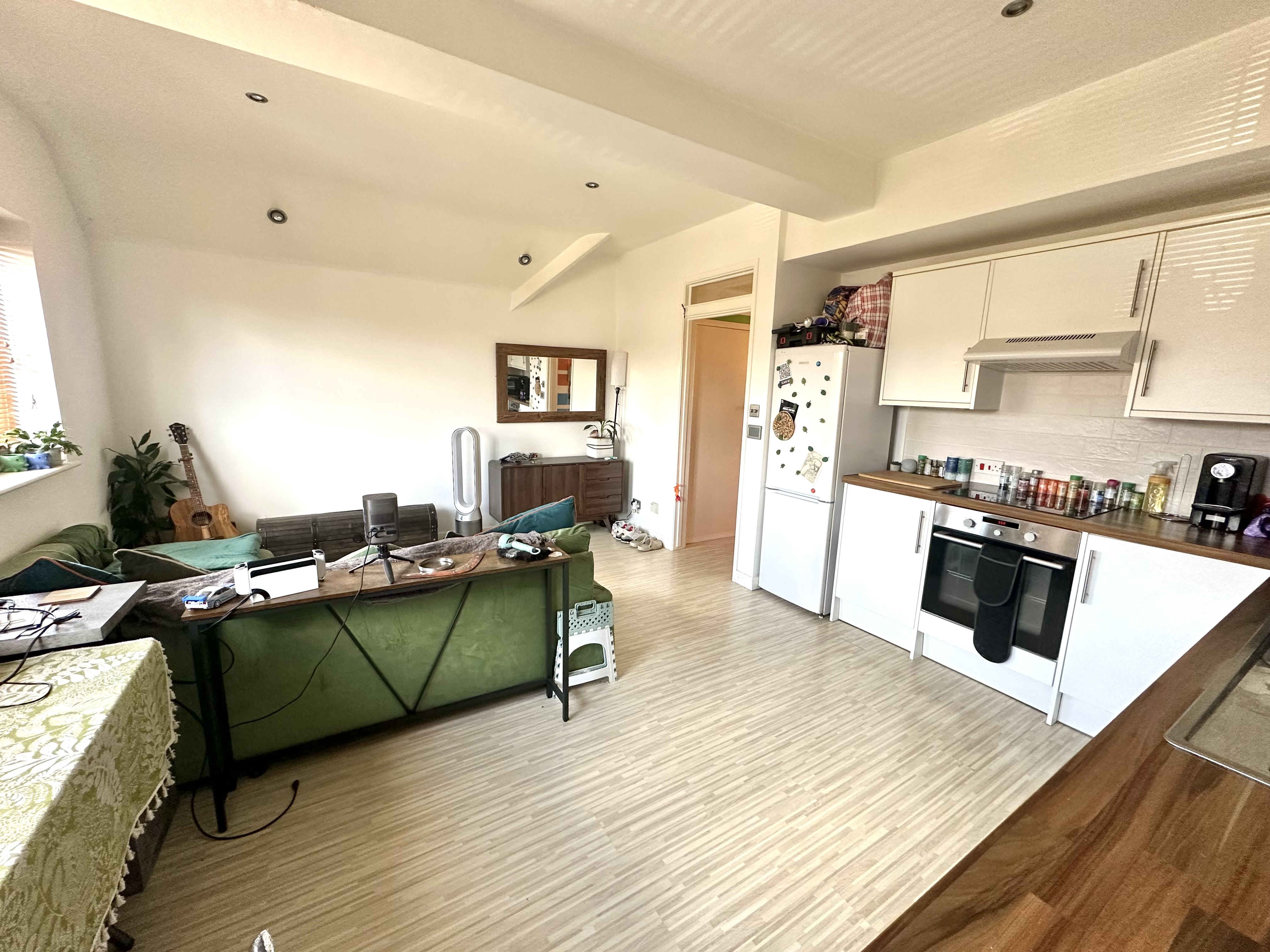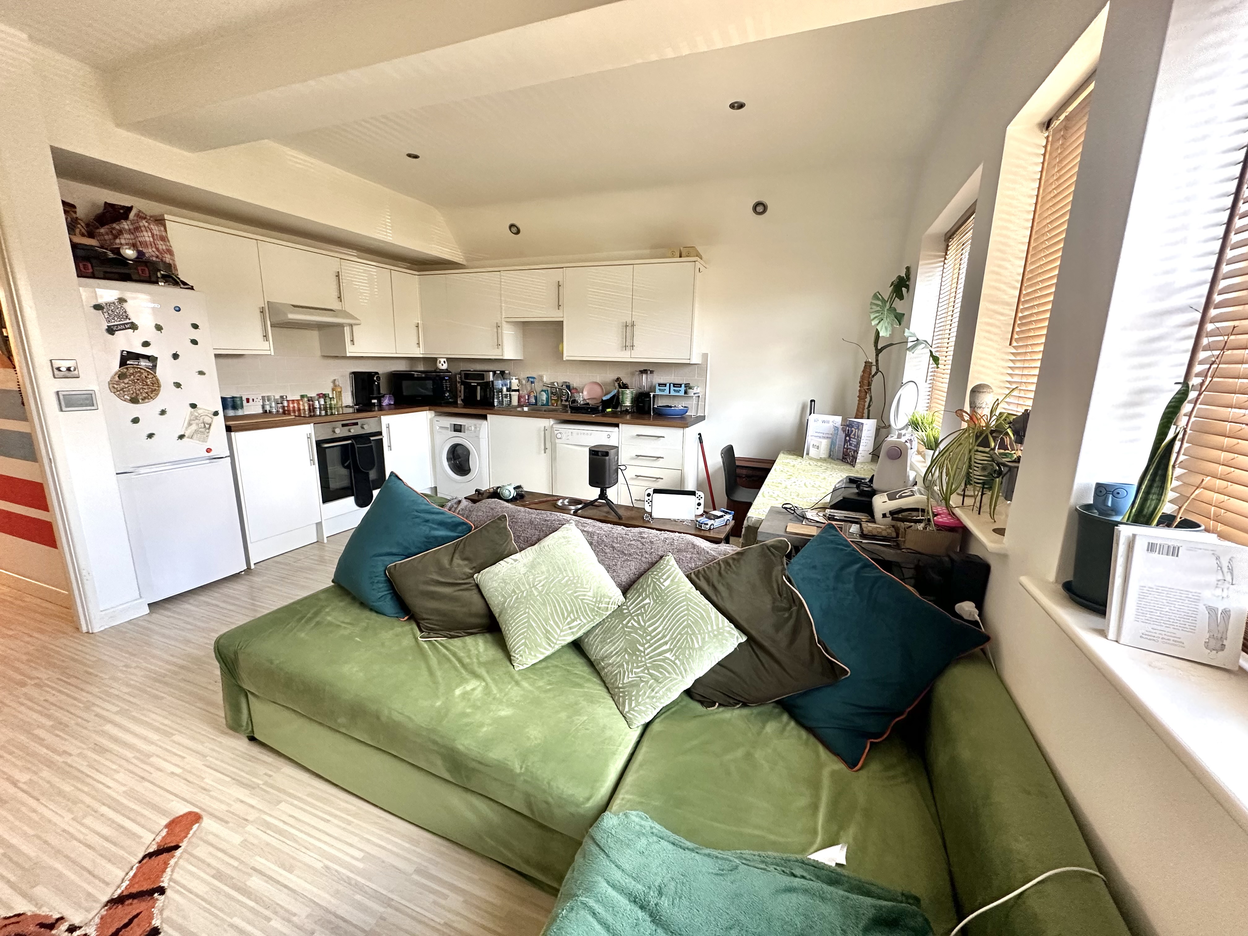 5.0m x 4.39m (16' 5" x 14' 5") Three windows overlooking front, Laminate flooring, sitting area with dining area, halogen downlighters, 4 ring electric hob, electric oven, dishwasher, fridge / freezer, washing machine, stainless steel sink, tiled splash backs.