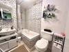 2.59m x 1.65m (8' 6" x 5' 5") A white suite with chrome fitments, Mira power shower, partly tiled walls close coupled WC, wash hand basin, extractor fan.