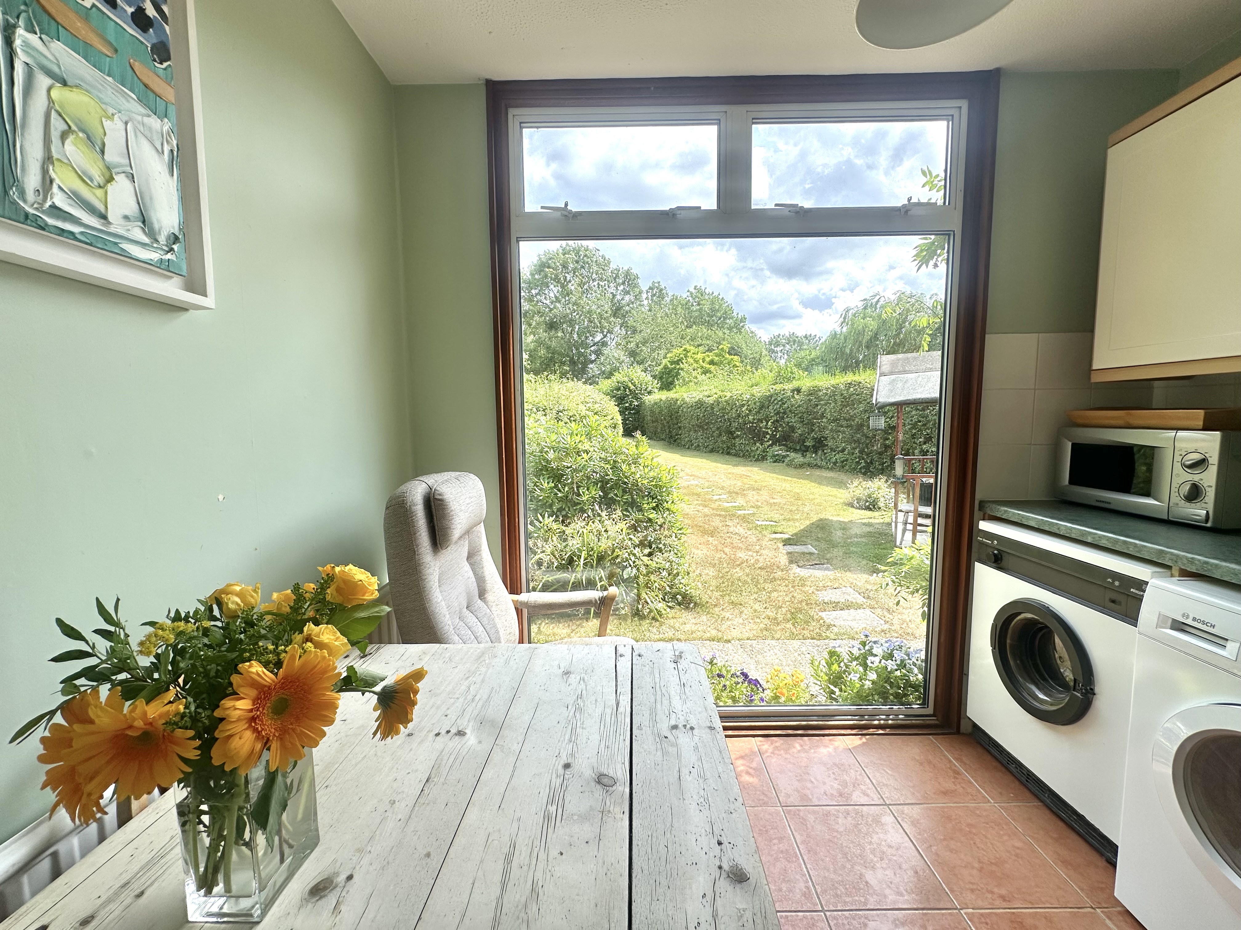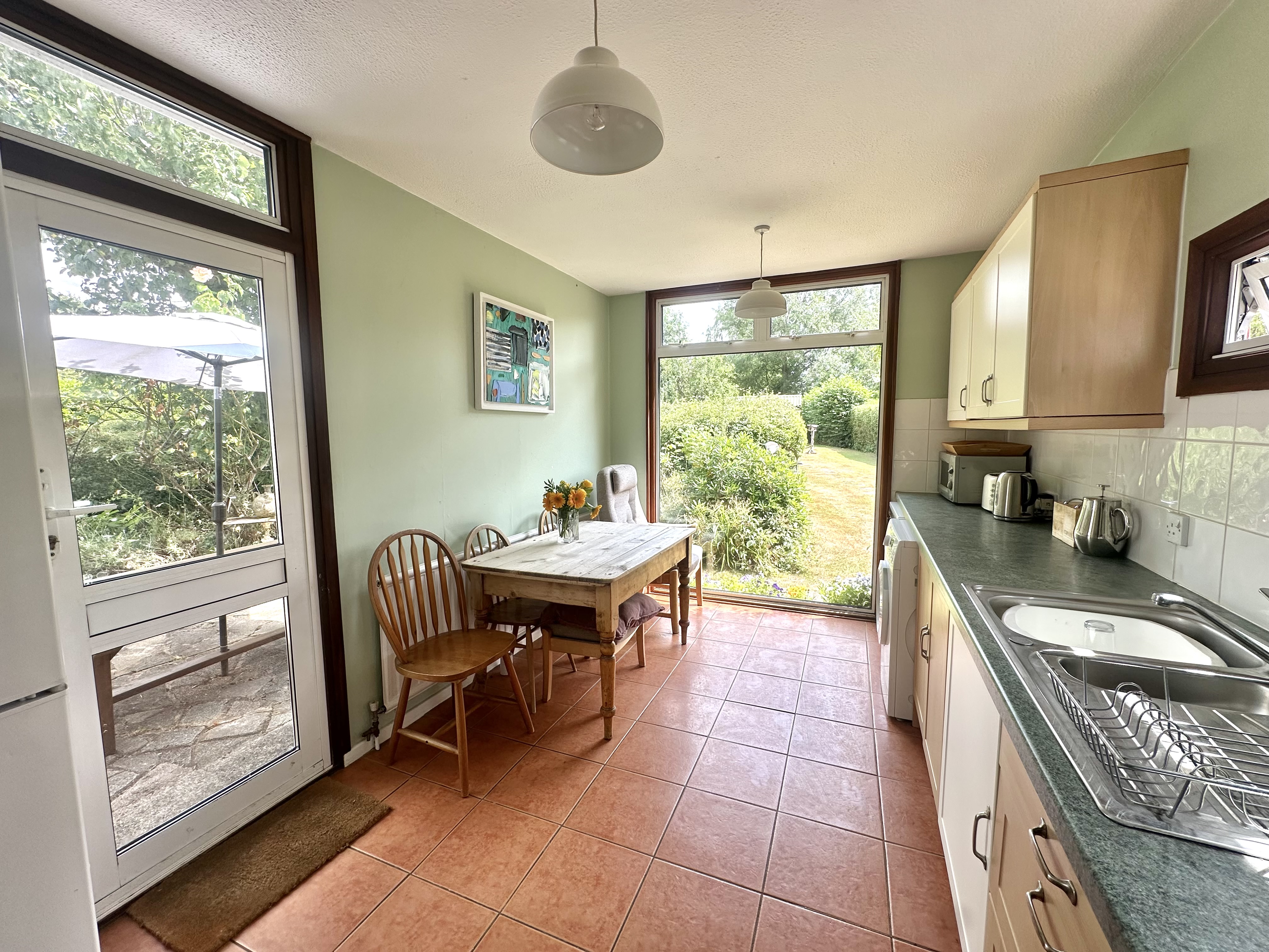 Feature picture window with views up the rear garden, door leading to the side patio, a range of units in a maple wood effect, tiled flooring, space for dining table and chairs, 4 ring gas hob, electric oven, 1.5 bowl stainless steel sink.