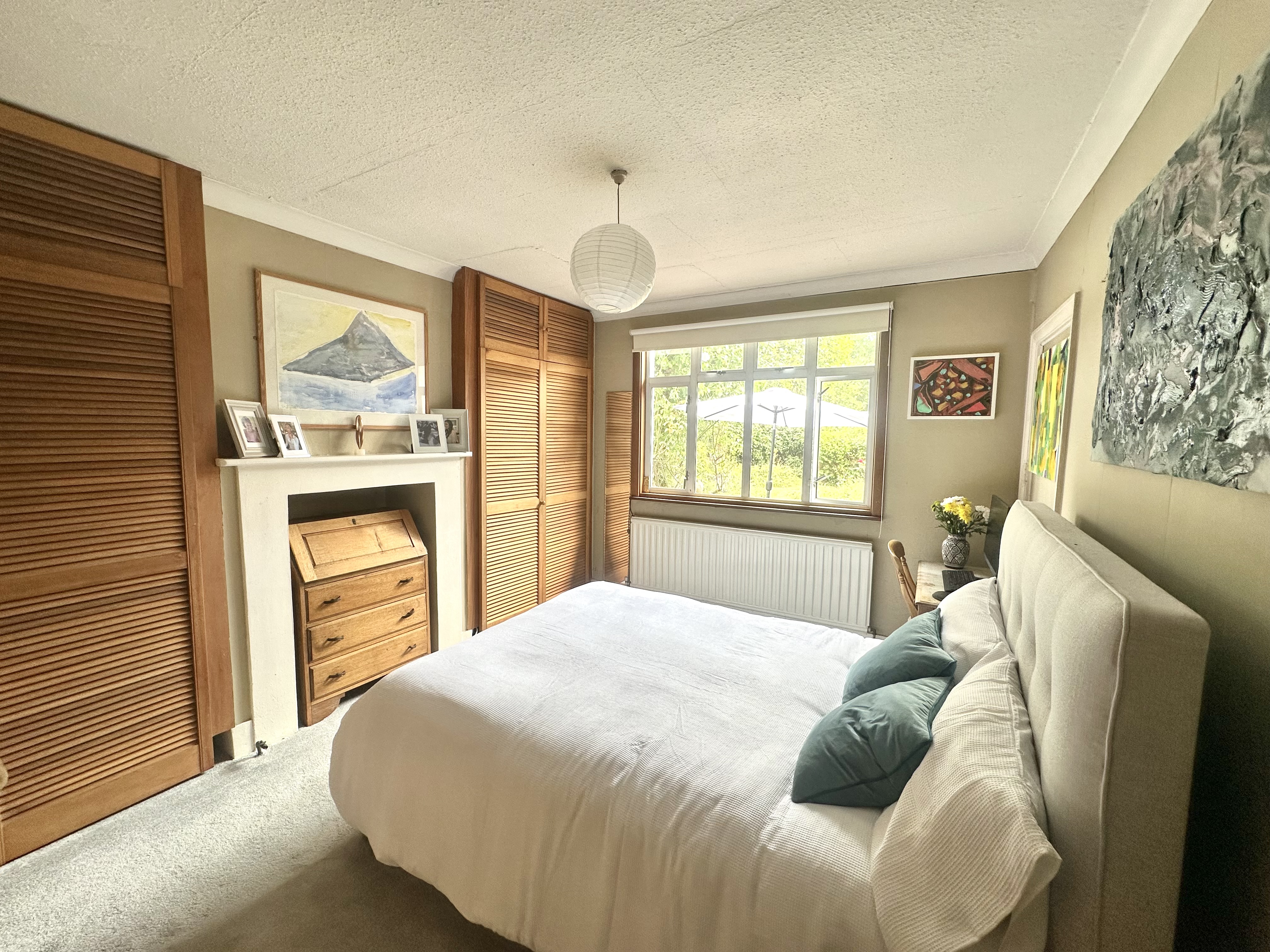 Window overlooking the rear garden, two built in wardrobes, chimney breast with painted wood surround, radiator.