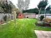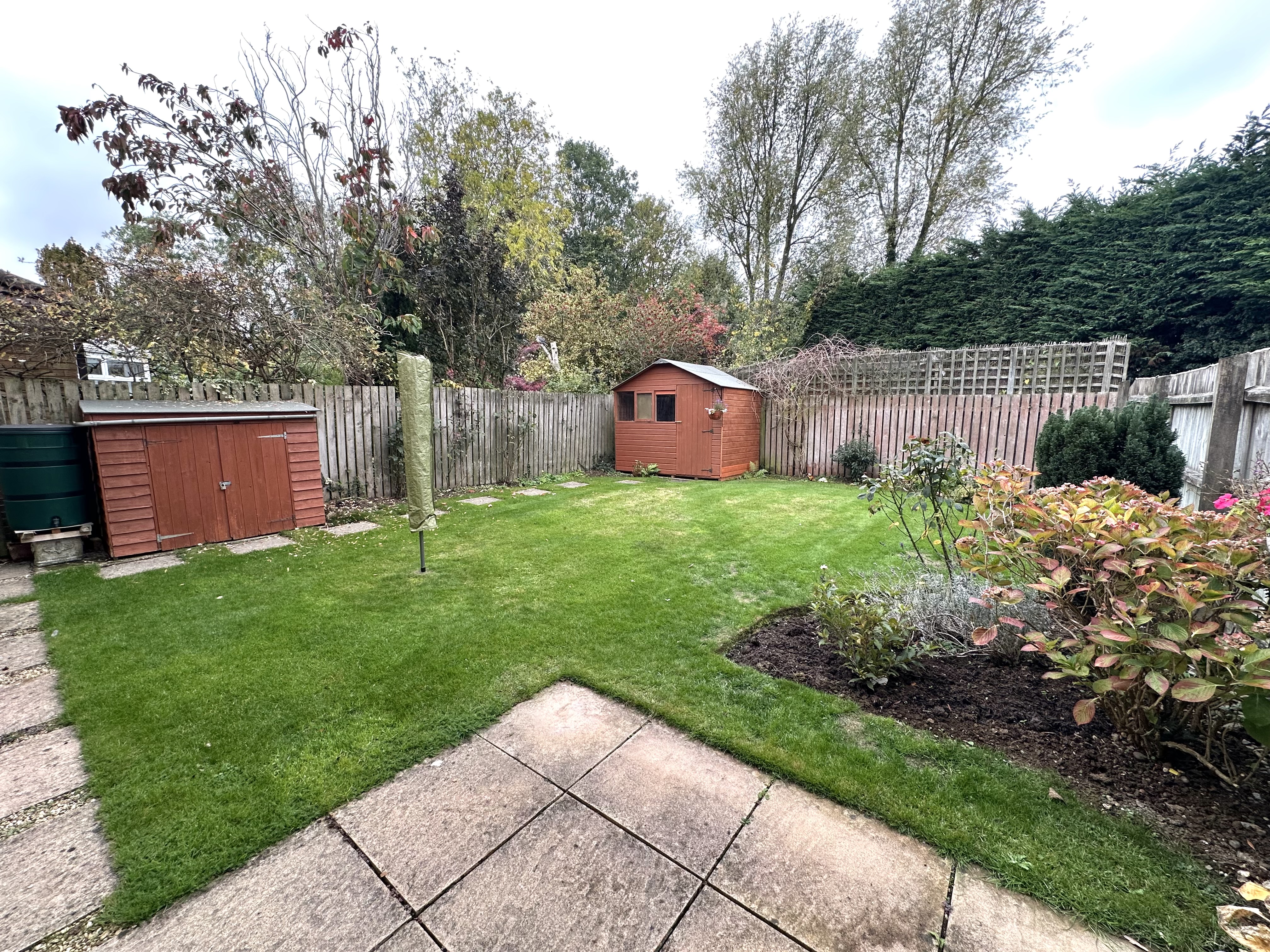 Mainly laid to lawn with shrub beds and boarders, with a private paved patio area, garden shed, pedestrian access to the front drive way.