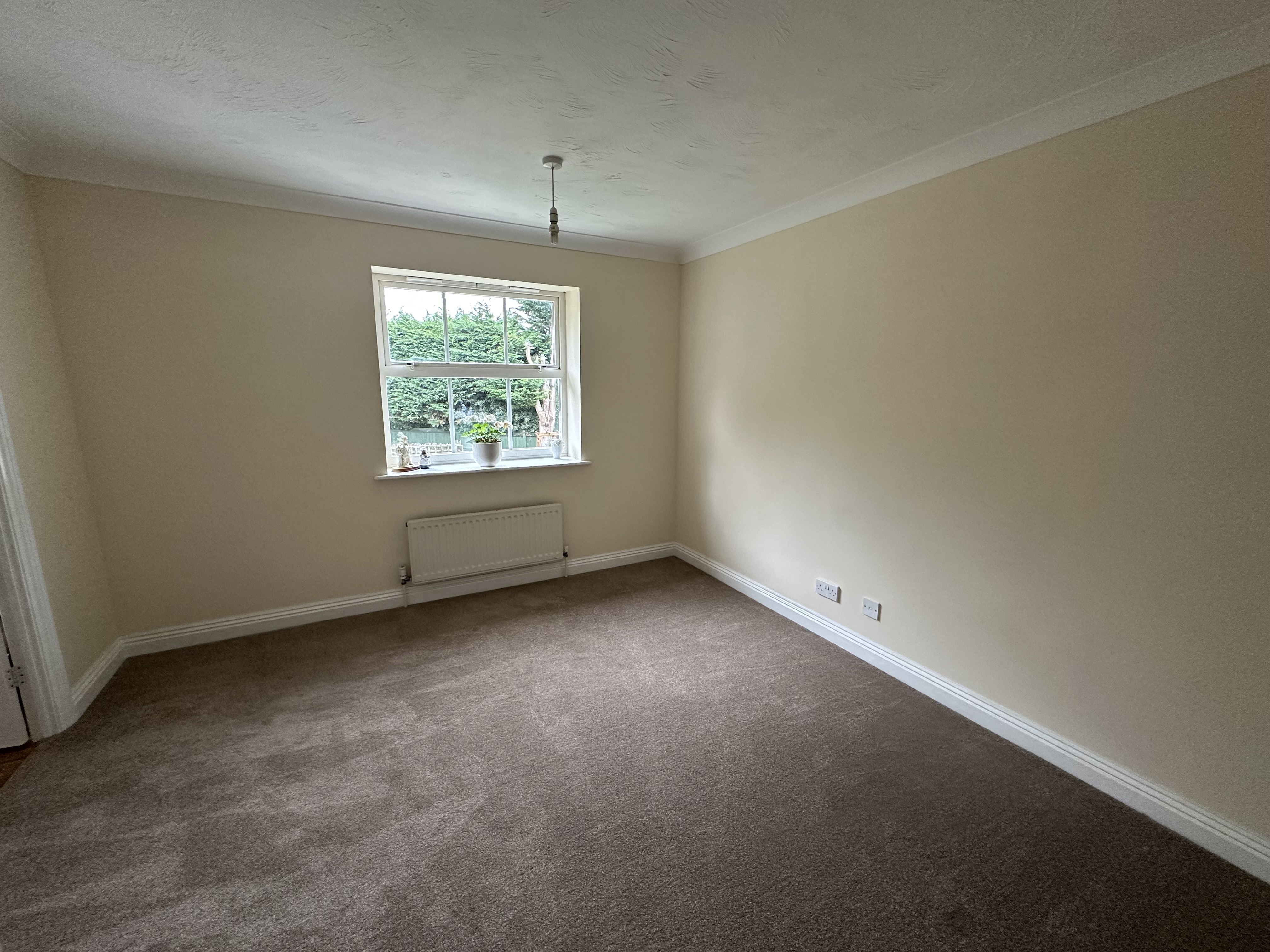 A large feature bay window looking over the front driveway, fireplace with white wood surround. Coved, opening leading to