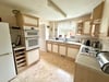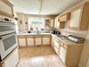 A range of wall and base units in a cream colour with rolled edge work surfaces, 4 ring gas hob, electric double oven, space for fridge freezer, window overlooking the rear garden, door leading to