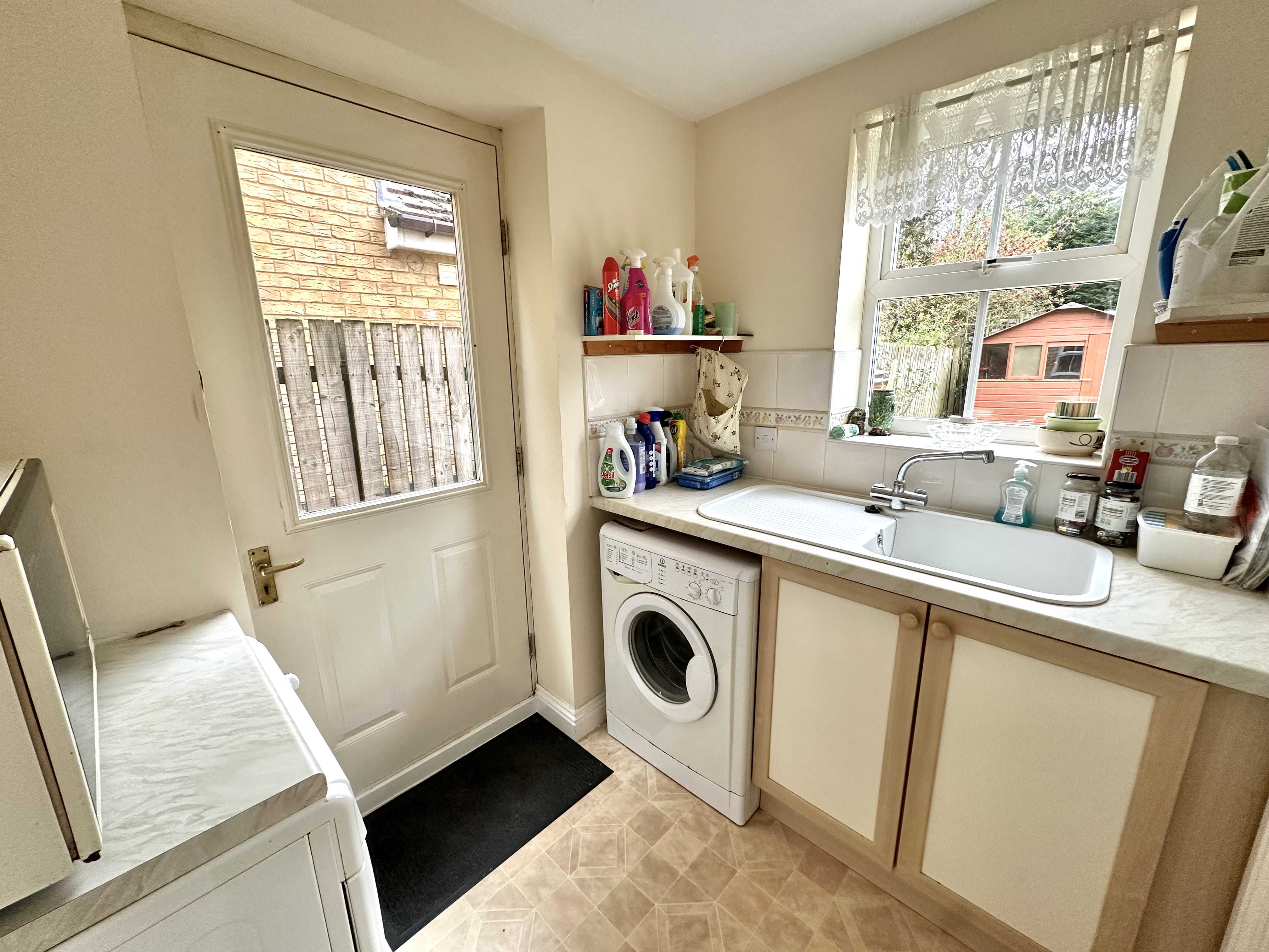 A range of units in a cream colour, sink with chrome mixer taps, plumbing for washing machine, space for tumble dryer, door leading to the side passageway, door leading to the WC/Cloakroom.