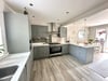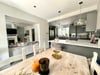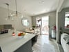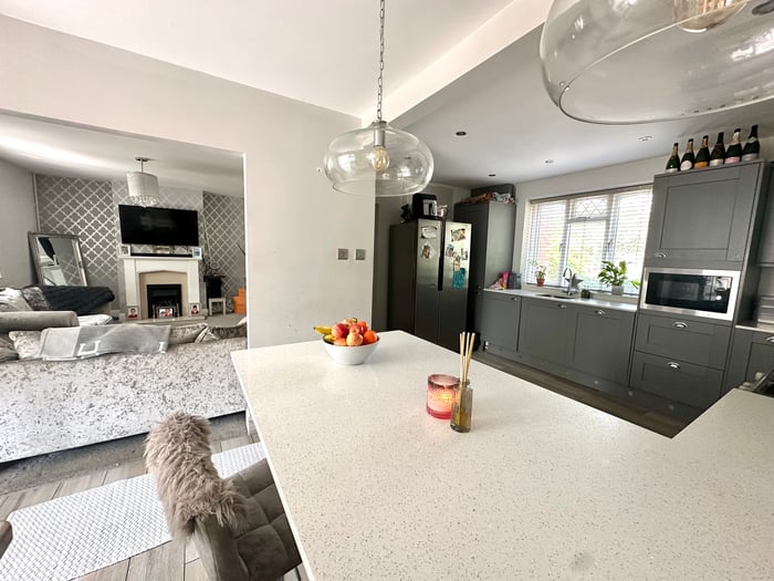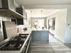 The room has been re modelled and re fitted and is now a kitchen diner with a breakfast bar area, space for a dining table and an opening into the sitting room. There is a range of wall and base units in light grey with white granite work surfaces, recessed stainless steel sink, integrated microwave, space for range style gas cooker, kick space lighting, porcelain tiled flooring, tiled splash backs, integrated dishwasher and washing machine.