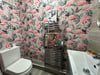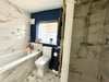Window to front, bath tub with tiled side panel, fully tiled walls in a stunning porcelain marble look tile, gold mixer taps with hand held shower attachment, close coupled WC, built in shower cubicle with wall mounted shower mixer, centrally heated towel radiator, wash hand basin. tiled floor.