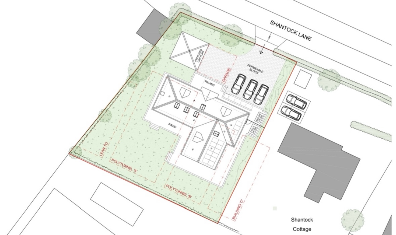 Removal of existing polytunnels, garage and lean-to shed building and construction of three bedroom detached family dwelling with detached car port.