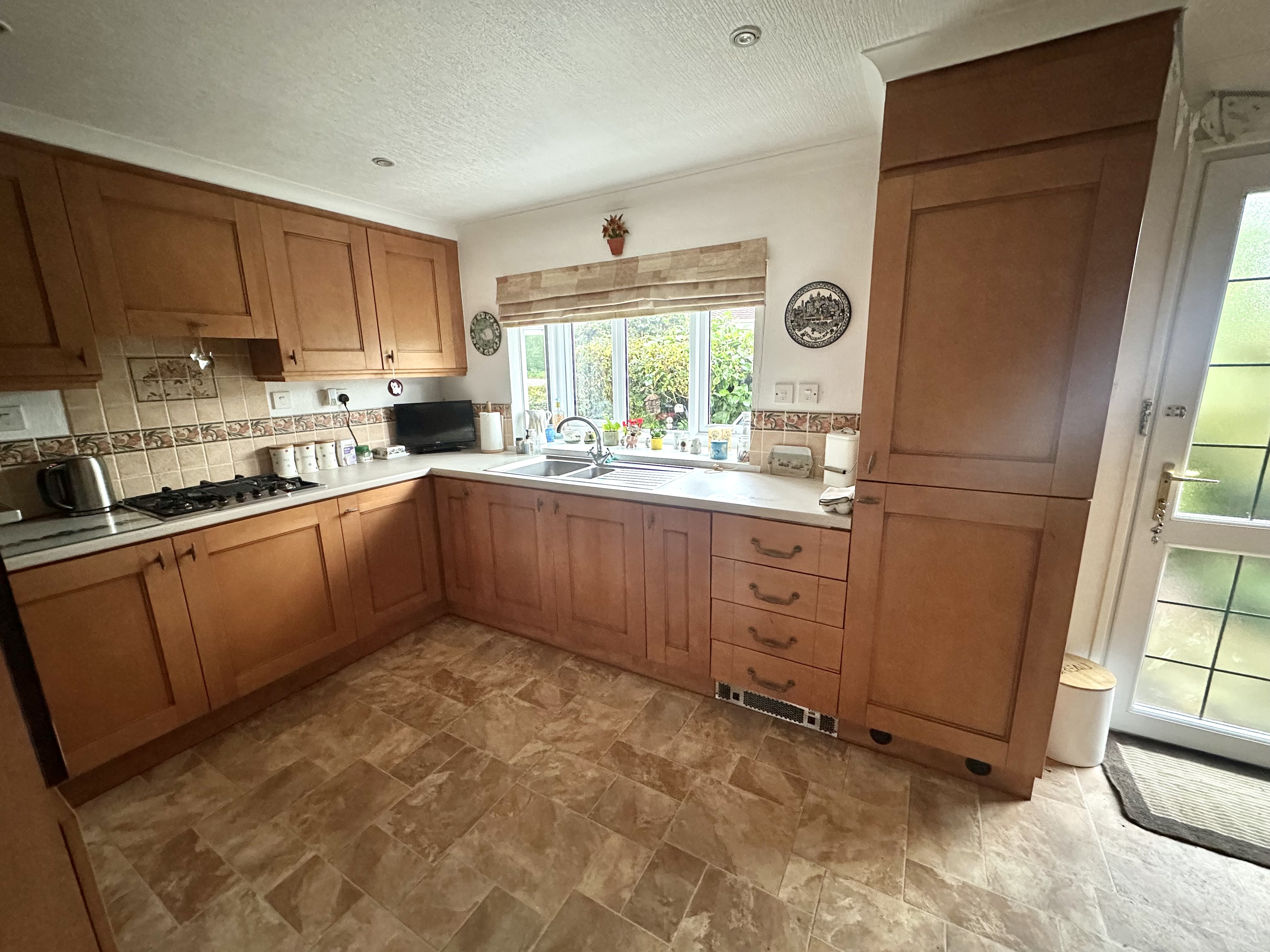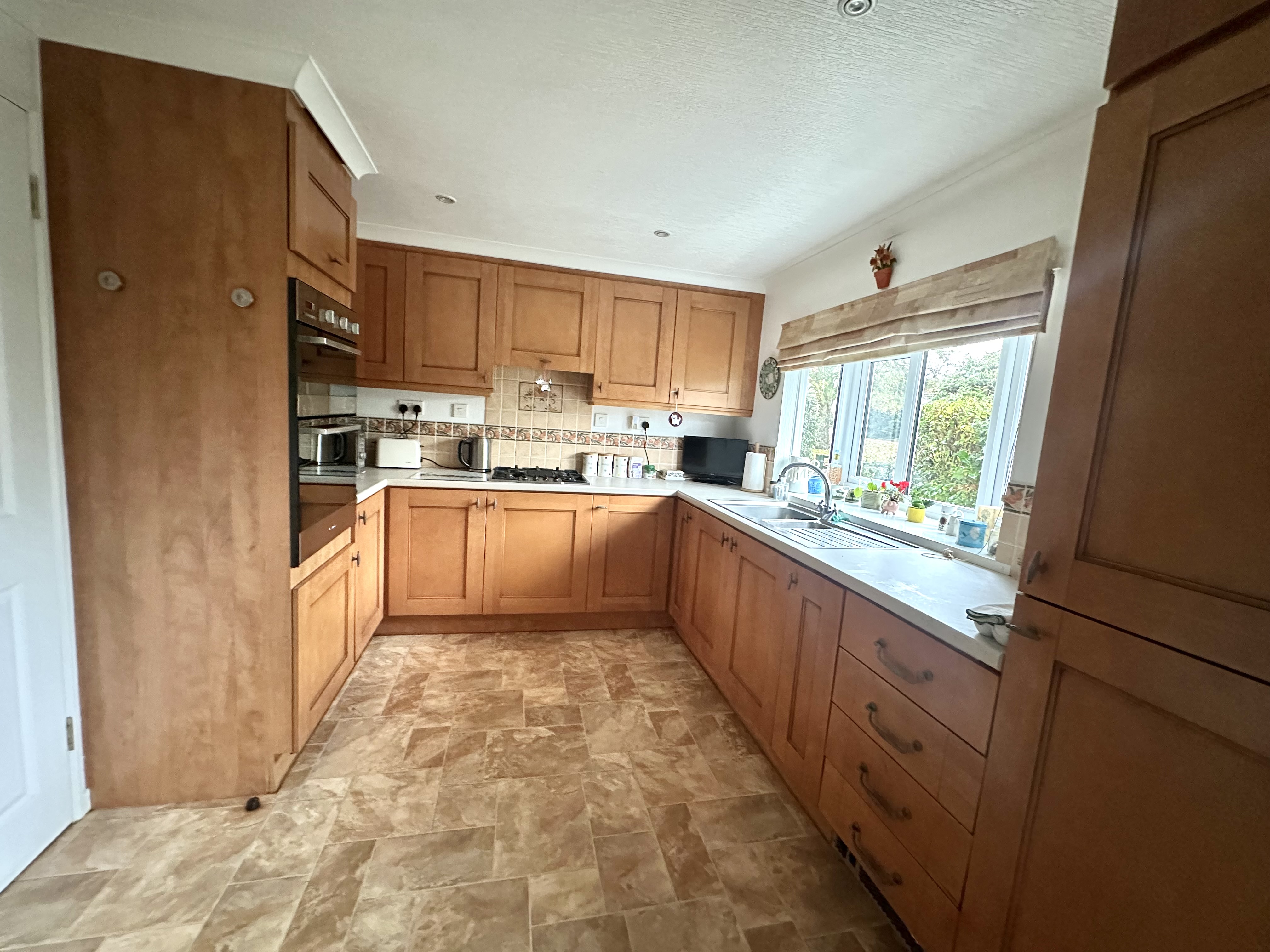 A range of wall and base units in a light wood with granite effect work tops, 1.5 bowl stainless steel sink, integrated four ring gas hob, stainless steel double oven, integrated fridge and freezer, plumbing for washing machine, plumbing for dishwasher, cupboard housing Worcester Bosch mains gas central heating boiler, LED down lights, bay window to side and door leading to the rear garden.
