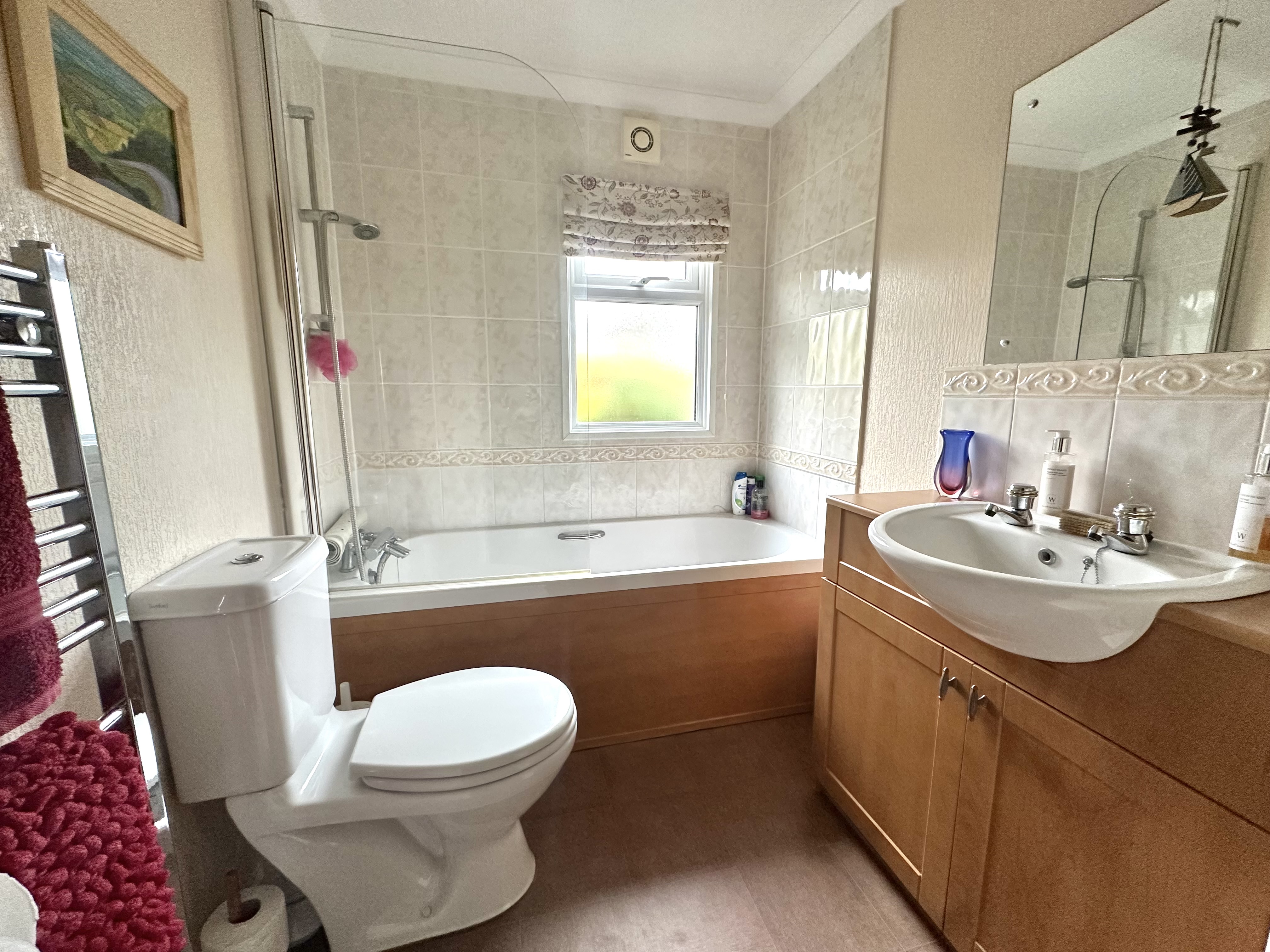 Window to rear, a panelled bath with fixed glazed shower screen, chrome shower mixer taps, wash hand basin recessed into vanity unit, close coupled WC, centrally heated chrome towel radiator, extractor fan and down lights.