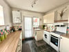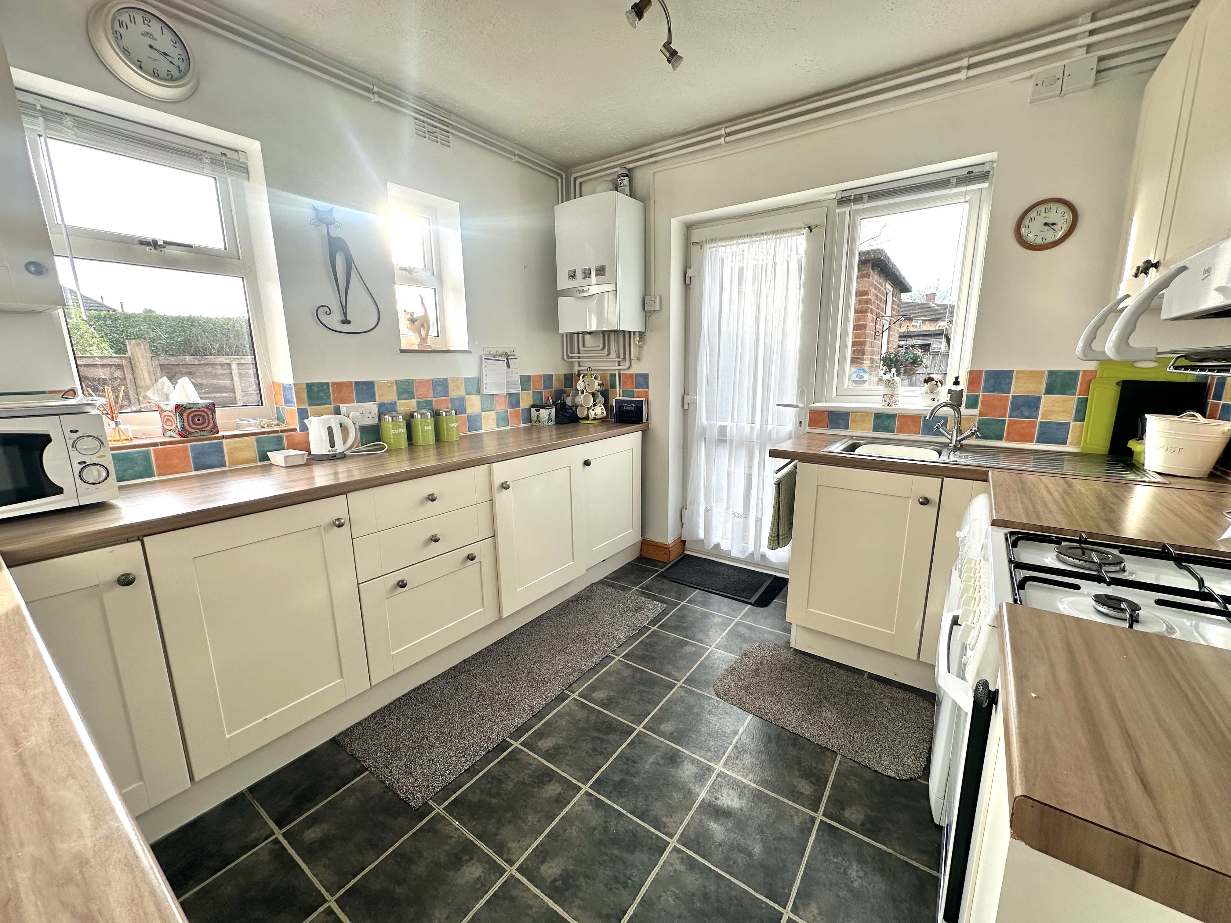 A range of wall and base units in cream colour with wood effect rolled edge work surfaces, stainless steel sink, integrated under work top fridge and freezer, plumbing for gas oven, wall mounted replacement gas Vaillant combi boiler, plumbing for washing machine, window and door leading to a private paved patio area and rear garden.