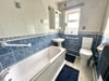 Window to rear, a white suite with chrome fitments, comprising of a panelled bath with fixed glazed shower screen and wall mounted shower mixer, pedestal wash hand basin, close coupled WC, radiator. Tiled flooring.