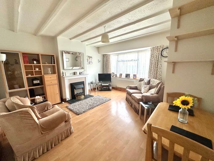 A large feature bay window to front, chimney breast with white wooden mantle and tiled surround, wood effect flooring. Radiator. TV point.