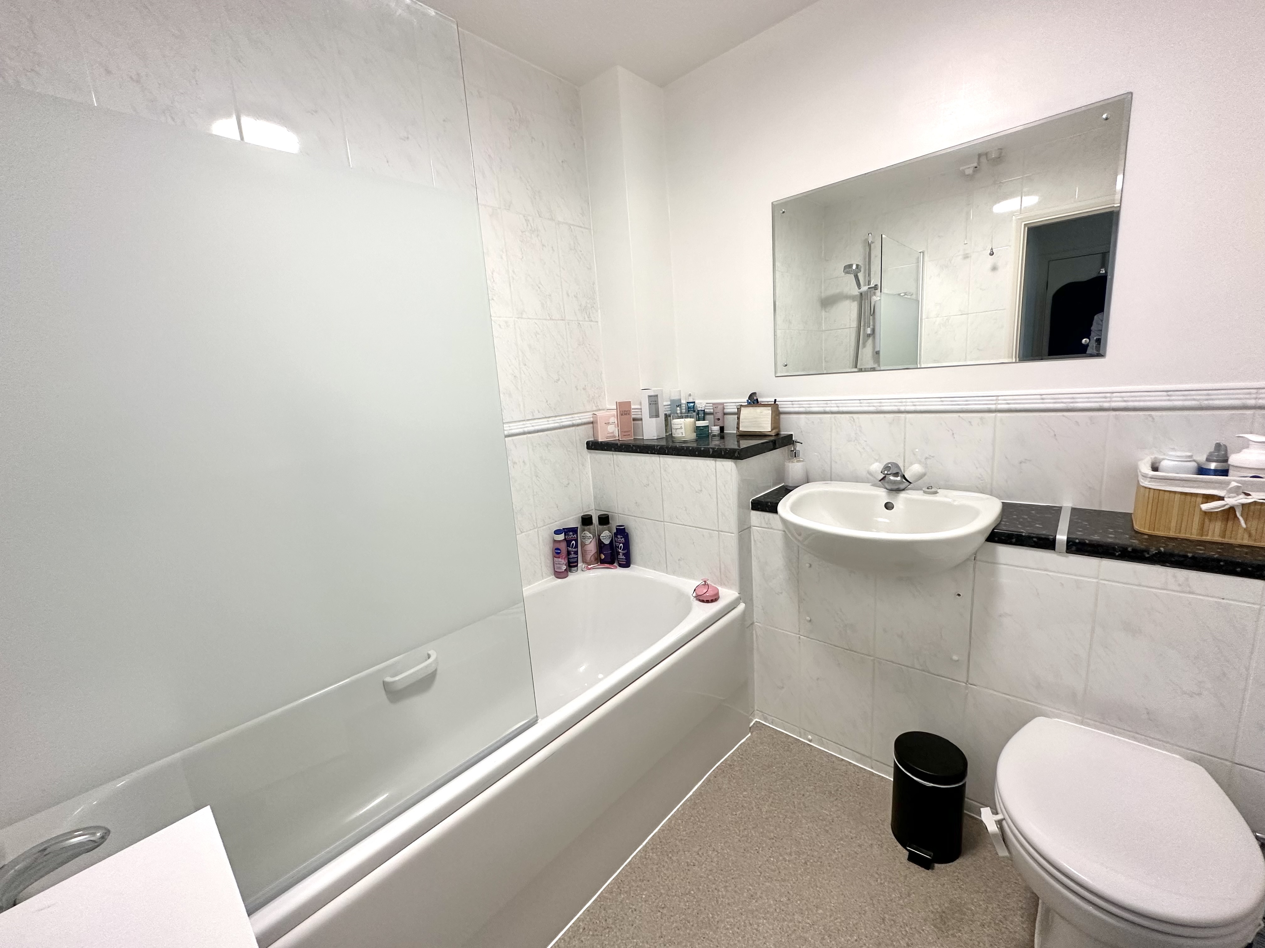 1.985m x 2.056m (6' 6" x 6' 9") Comprising of three piece white suite, WC with push button flush, wash basin with stainless steel mixer taps, bath with mira electric shower, stainless steel mixer taps ,chrome towel rail,, fixed wall mirror, extractor fan.