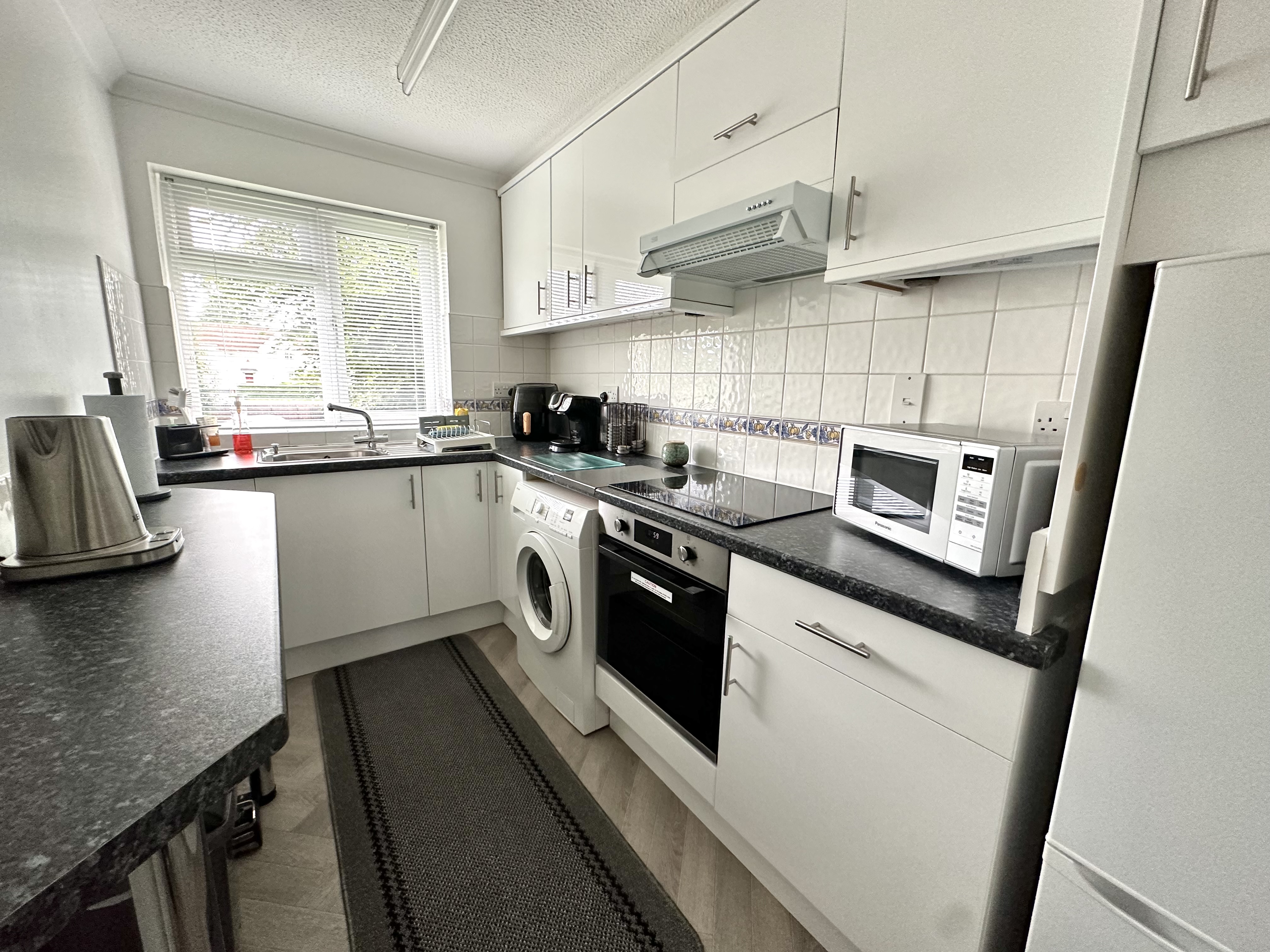 1.868m x 3.390m (6' 2" x 11' 1") Double glazed window to rear , comprising of a range of wooden wall and base units with space for a washing machine and fridge freezer, tiled splash backs , single stainless steel sink and drainer, ceramic hob, electric oven, neff extractor fan, breakfast bar.
